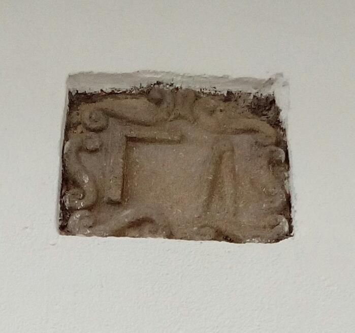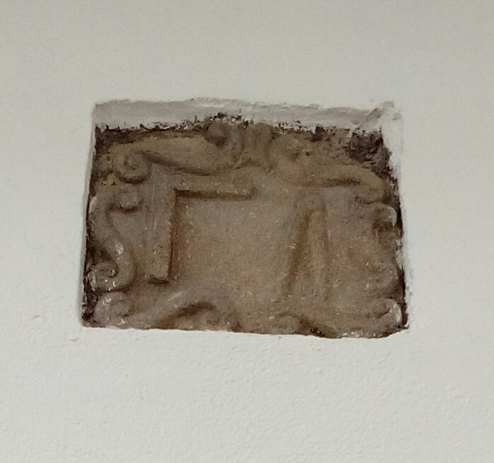 Escudo esculpido en piedra, que representa una escuadra y un compás, símbolos de la división de arquitectos de la masonería.